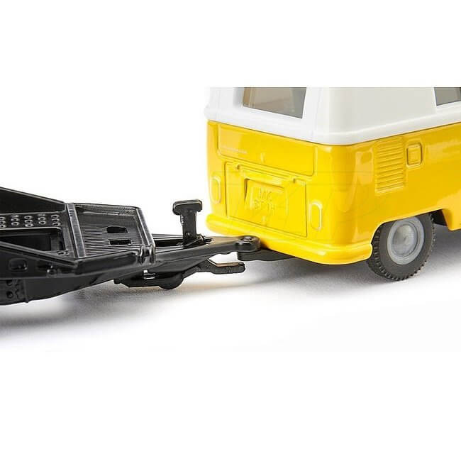 VW Beetle szállítása utánfutón! A SIKU Volkswagen T1 utánfutóval és VW bogárral egy sárga-fehér színű Volkswagen T1 furgon nyitható oldalajtóval ami egy világoskék Volkswagen bogarat szállít utánfutón