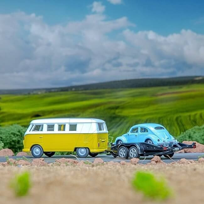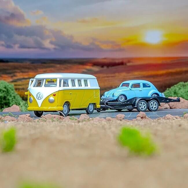 A SIKU Volkswagen T1 utánfutóval és VW bogárral furgon modell utánfutójára könnyen fel tudsz állni a Volkswagen bogárral és elszállíthatod a kiállításra
