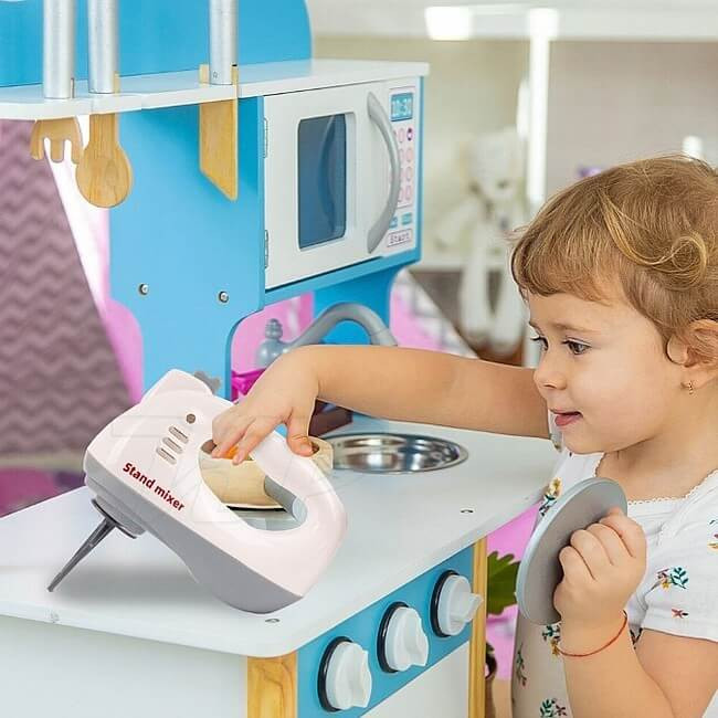 A Tegole Konyhai robotgép háromféle cserélhető fejjel érkezik, így a gyerekek dagasztást, habverést vagy sima keverést is eljátszhatnak. A fejek könnyedén cserélhetők, egy mozdulattal fel- és lepattinthatók, hogy még izgalmasabb legyen a játék!