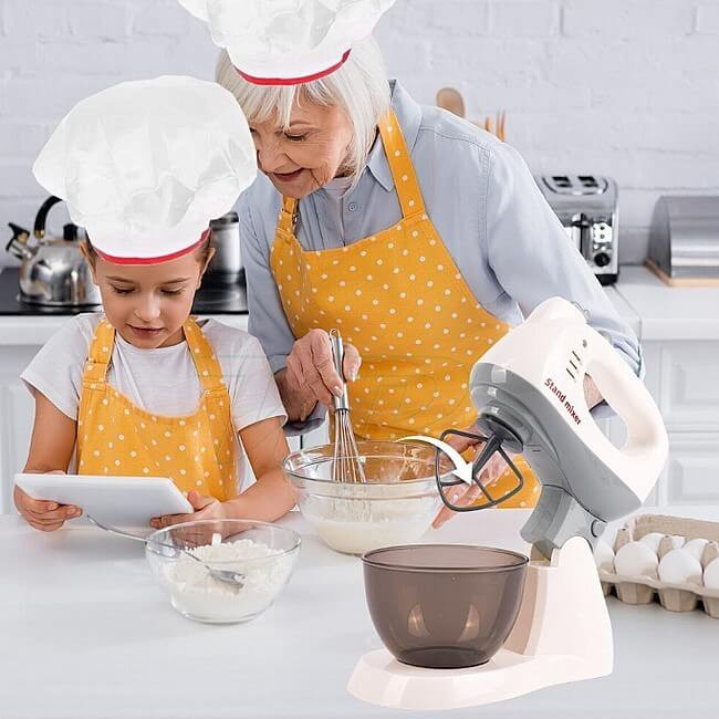 - Kiegészítők: 3 cserélhető fej (dagasztó, habverő, keverő)
