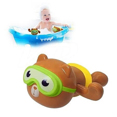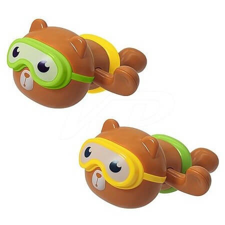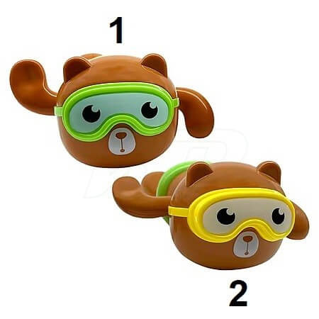 A Vízben úszó maci fürdőjáték mechanikus meghajtással működik elem nem szükséges hozzá, a kedves arcú maci zöld vagy sárga úszószemüveget visel